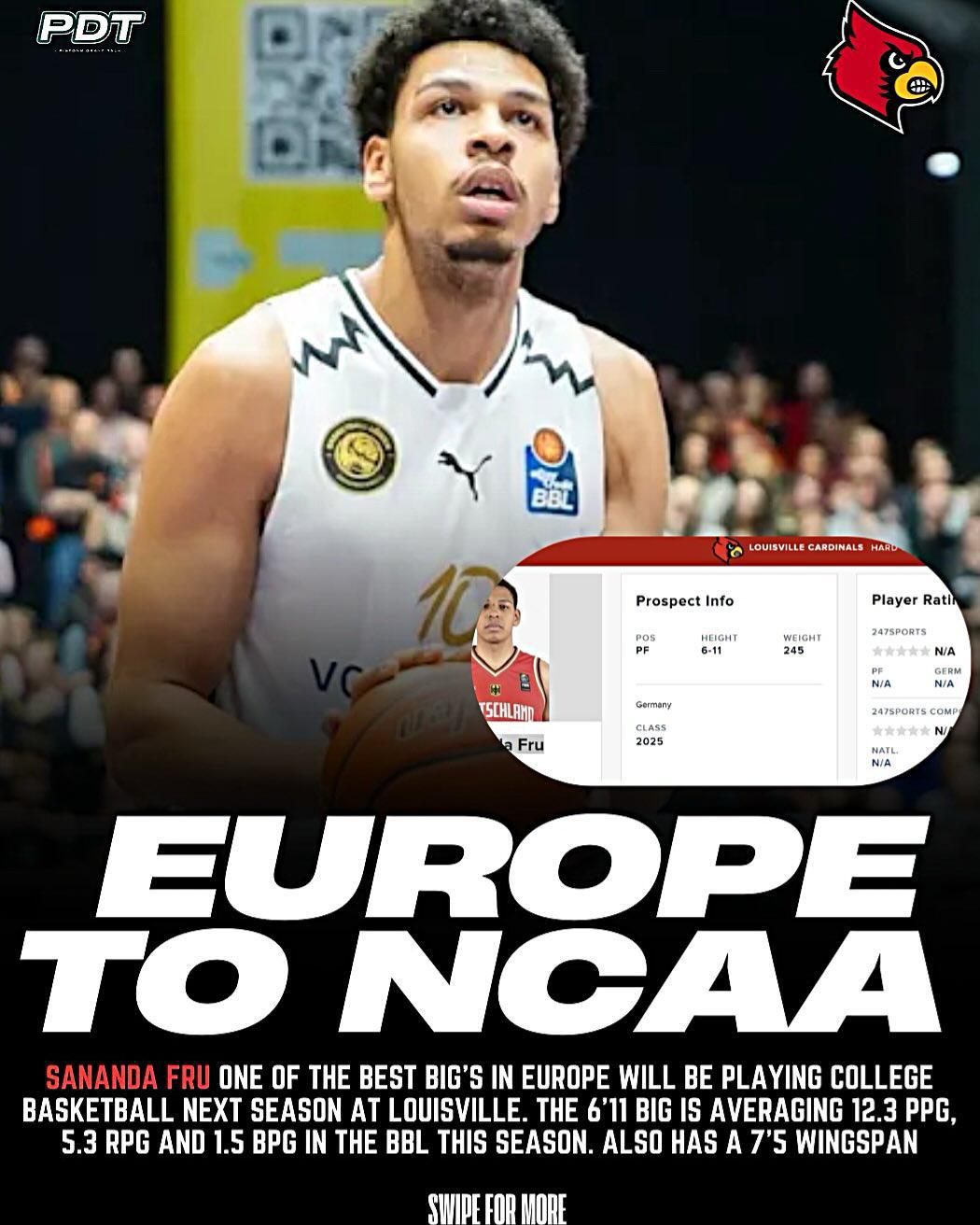 Sananda Fru(萨南达-弗鲁)是2003年出生于德国,效力于德甲联赛,承诺2025-26赛季加盟路易斯维尔大学。